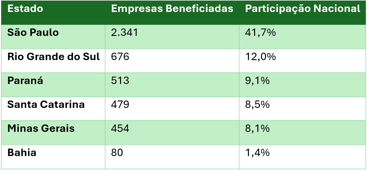 A concentração no Sudeste e Sul é evidente. Esses estados dominam com aproximadamente 73% de todas as empresas que usufruem da Lei do Bem, enquanto a Bahia, um estado com economia dinâmica, população significativa e potencial de inovação, representa menos de 2% desse universo.